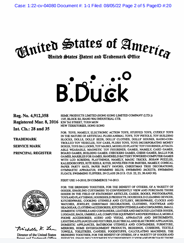 B.Duck品牌權利人為SEMK PRODUCTS LIMITED,最新案件在2022年8月5號發起,案件編號22-cv-4080。