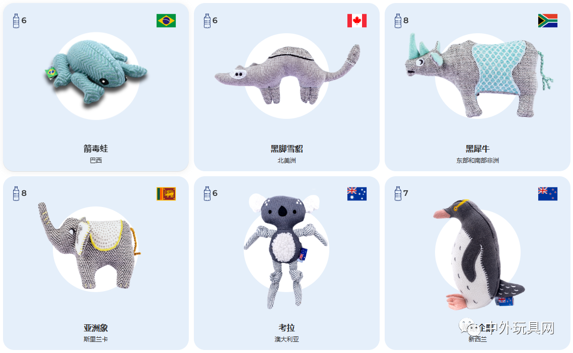 Avanti旗下環保玩具品牌RESPLOOT的毛絨產品,以全球各地珍稀動物為主題,且標注在制造過程中使用了多少回收的塑料瓶